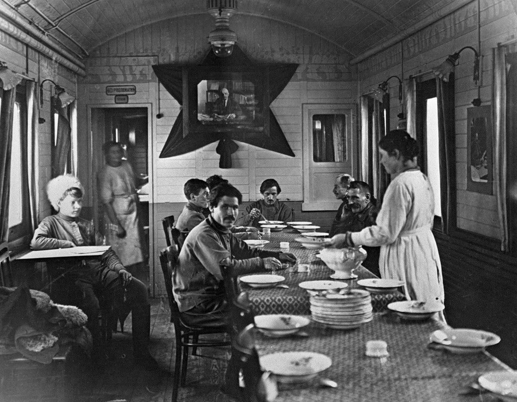 Поезд был не простым — агитационным. В те времена они были популярны, и очень важным для продвижения советской пропаганды на широкие массы людей. Все потому, что, когда закончилась революция, «новая власть» активизировалась в создании неправдивых фактов, чтобы захватить как можно больше не письменных приспешников и поднять боевой дух солдат. Так кроме плакатов и листовок тестировали еще достаточно экспериментальный тогда метод воздействия — агитационный поезд. Идея принадлежит всероссийскому центральному исполнительному комитету. А сам поезд сразу после создания поехал по железнодорожным путям, чтобы донести крестьянам и рабочими в разных уголках страны пропагандистские лозунги большевиков. На нем работала политическая секция Александровского района и располагалась типография. В составе из пятнадцати пассажирских и товарных вагонов оборудовали помещение для книг, а также было отделение телеграфного бюро. В некоторых источниках существуют факты о том, что там размещались даже проявочные лаборатории, монтажные мастерские и просмотровые, то есть прямо в дороге большевики создавали киноленты. В частности, в 1919-1920 годах местные периодические издания сообщали, что такие поезда провели почти 2 тысячи киносеансов — чаще всего демонстрировали картины-агитки о вреде пьянства, сельском хозяйстве и коллективном труде. Иногда агитаторы также показывали на станциях театрализованные действа, где были судьи, защитники, обвинители, подсудимые и свидетели — в роли виновных выступали противники революции. Так нашим предкам пытались объяснить, почему происходит Гражданская война, что им может дать советское государство, для чего надо сплотиться против «буржуев», белогвардейцев и других элементов, враждебно настроенных к «новой власти».